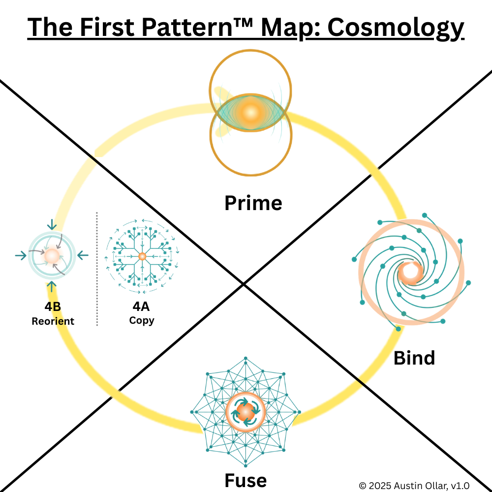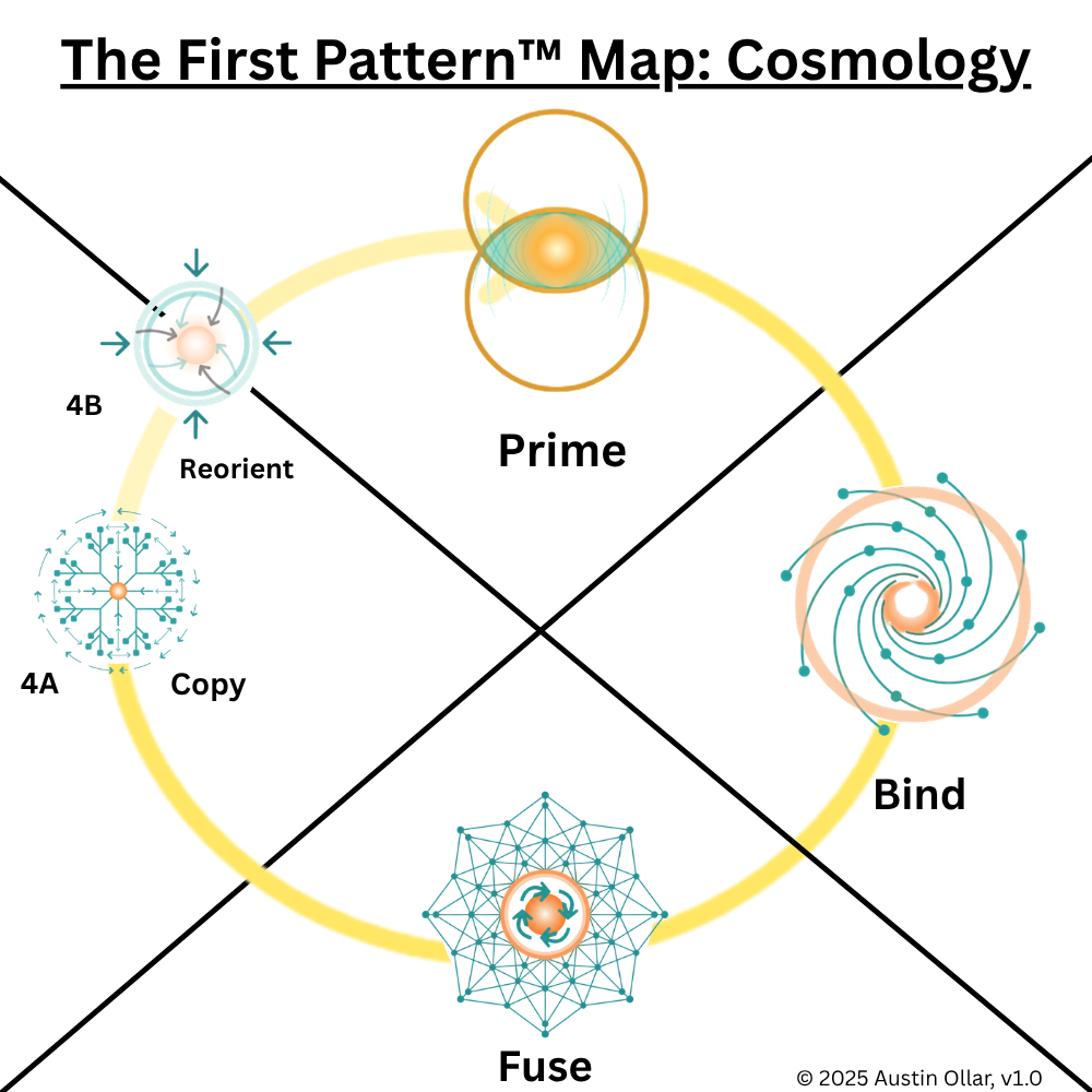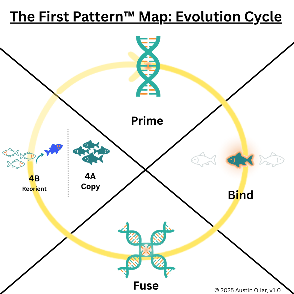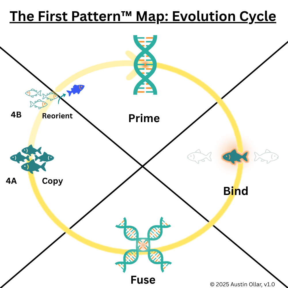 Reorient (4B): When conditions change or when copying no longer supports survival, the lineage must reorient. New pressures emerge, environments shift, and previously successful traits become less effective. This forces populations to adapt again, redirecting the evolutionary path and feeding the cycle back into a new round of Prime, Bind, Fuse, and Copy.