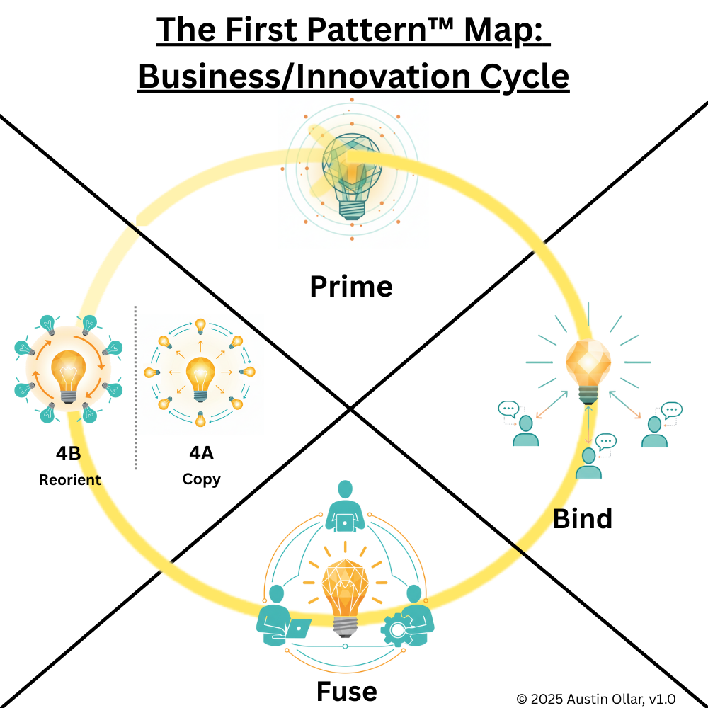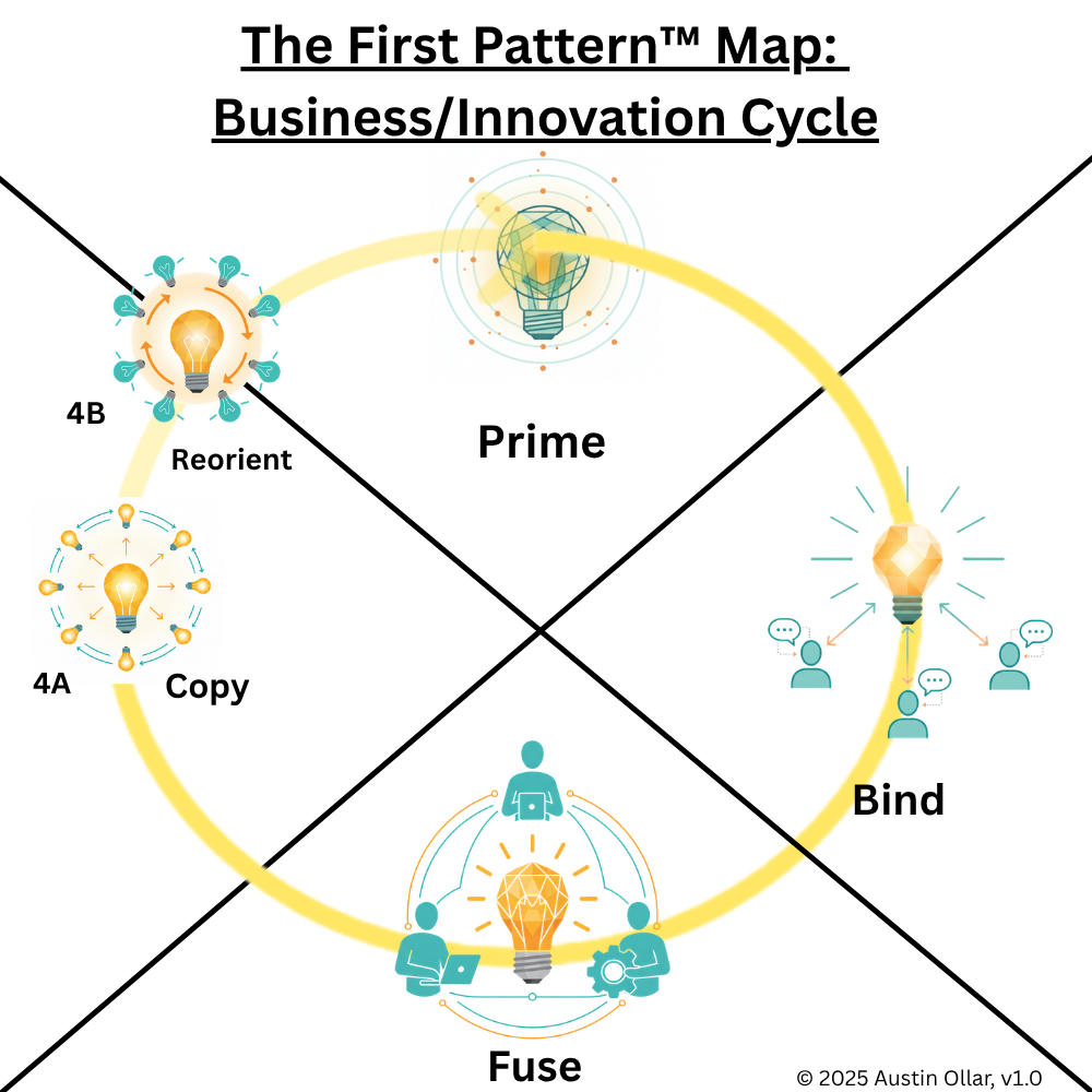 Reorient (4B): Eventually, growth by copying slows and patterns that once worked begin to plateau. The system shifts into reorientation. Strategies adapt, products pivot, and new directions are explored. 4B appears when continued replication is no longer sufficient, prompting the cycle to reset. The contents of the insight then feeds back into a new round of Prime, Bind, Fuse, and Copy, keeping the business ecosystem alive and evolving.