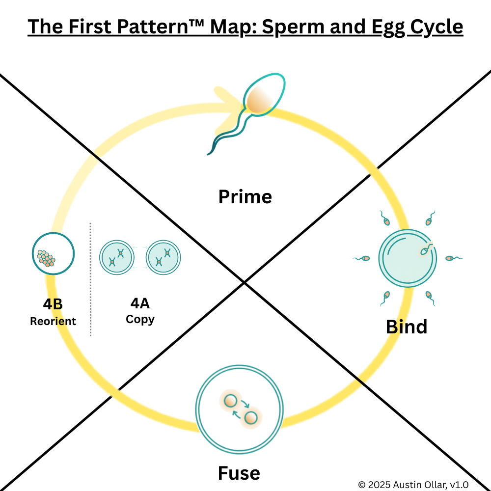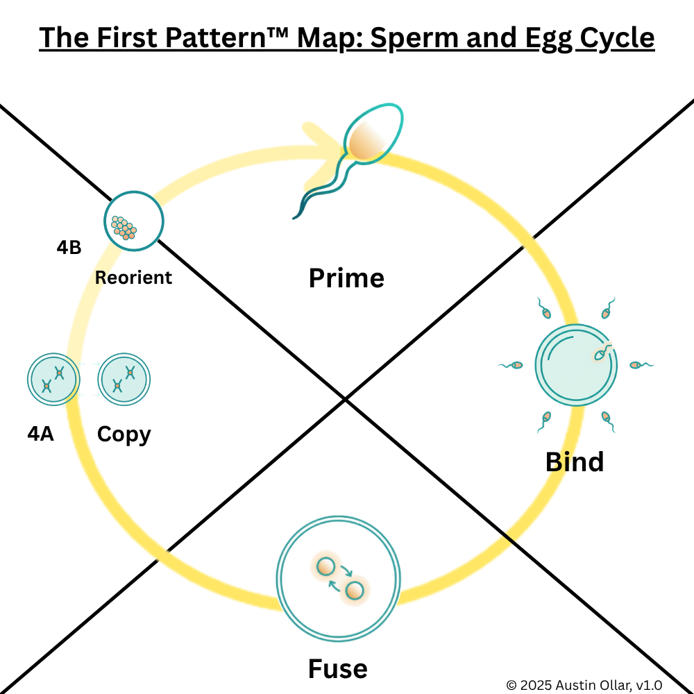 Copy (4A): Once fused, the new organism begins copying its genetic information through rapid cell division. This is propagation in its pure form, where a successful pattern replicates outward. As long as internal exchange and signaling pathways remain stable, the cycle stays in 4A, multiplying structure and building momentum.