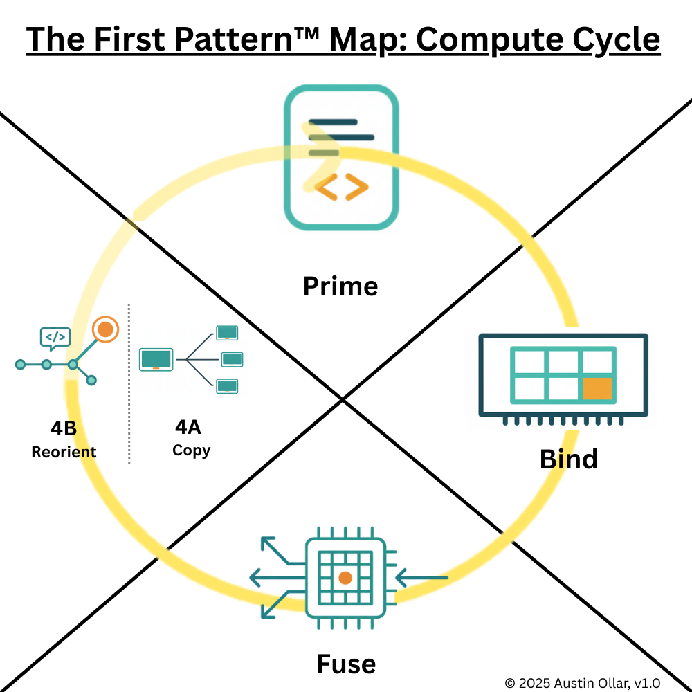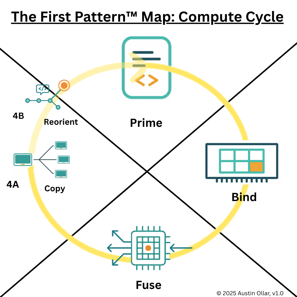 Reorient (4B): When the environment changes, or when copying and repetition are no longer sufficient, the system must reorient. This may involve updating models, recompiling code, reallocating resources, or routing data through new paths. 4B appears when the computational pattern must adjust, feeding back into a new round of Prime, Bind, Fuse, and Copy.