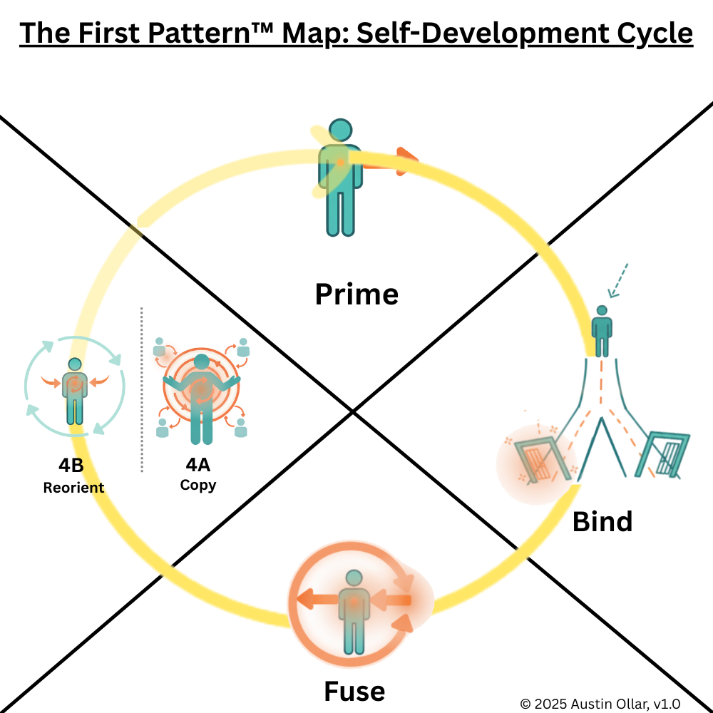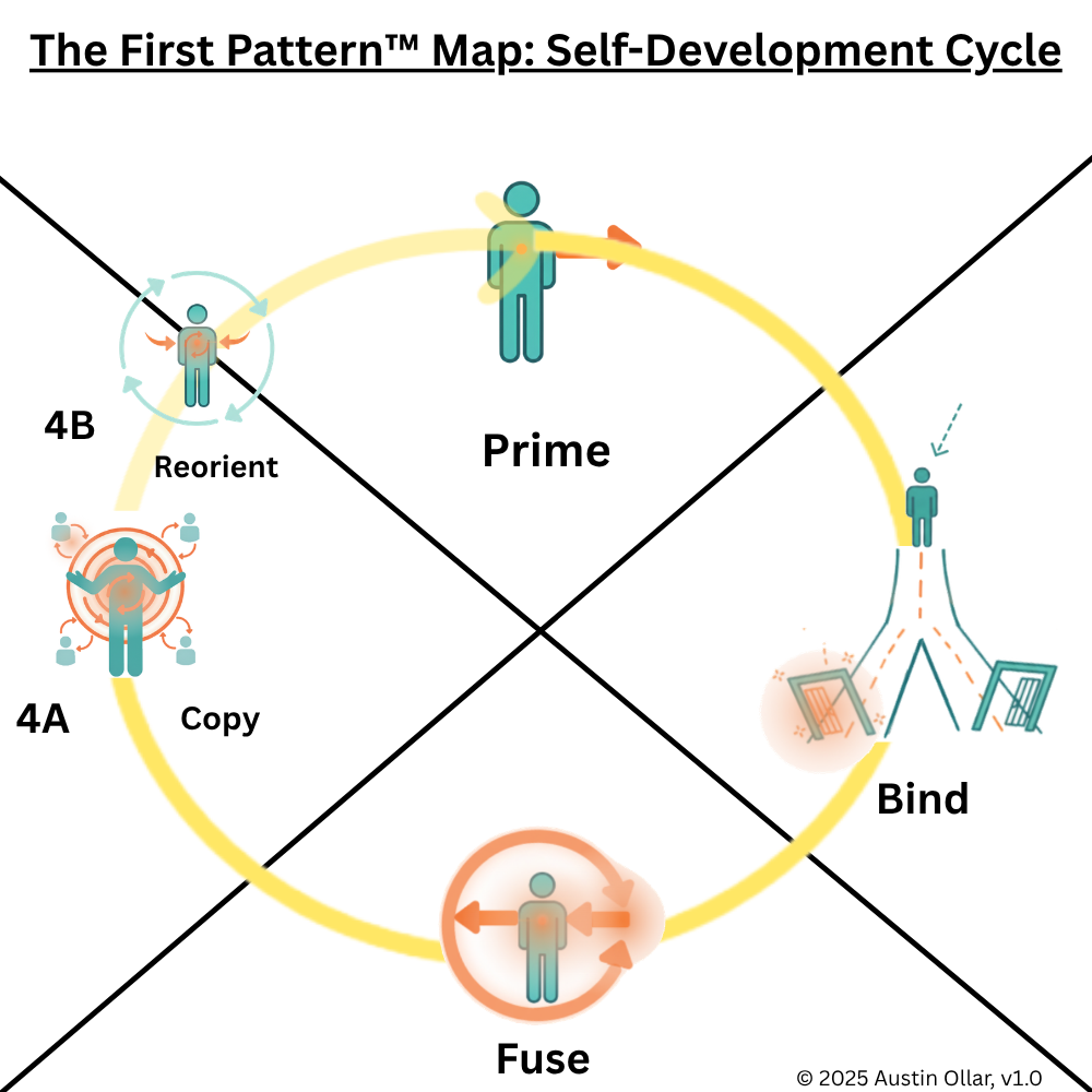 Reorient (4B): Eventually, the pattern that once scaled begins to level off. The contribution no longer grows in the same way, or the person senses that their direction no longer reflects who they are becoming. This triggers 4B reorientation. They pause, reassess, and redirect their path to stay aligned with new potential. This stage closes the loop by feeding back into a renewed round of Prime, keeping growth continuous and self correcting.