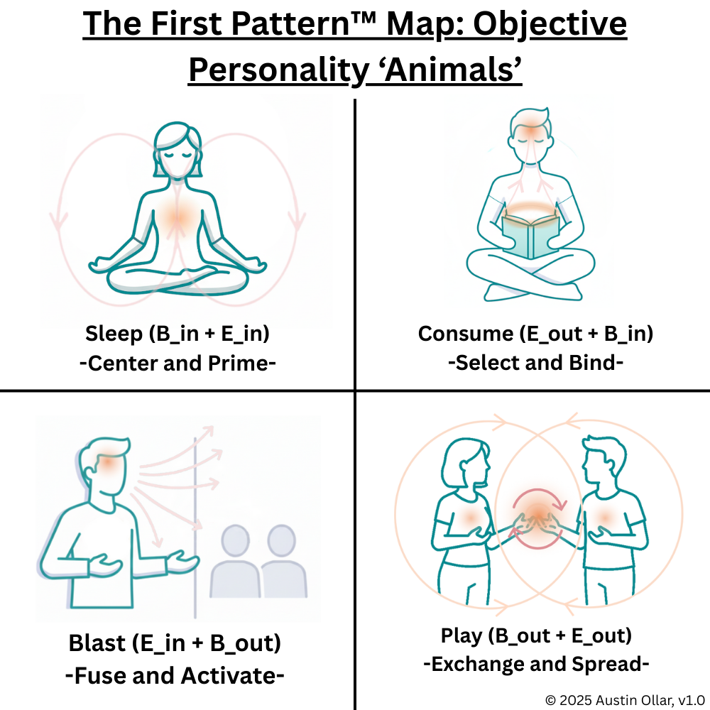 Sleep reflects the inward stabilization move. Bind Inward protects and consolidates personal energy, while Explore Inward reviews patterns, impressions, and internal trajectories. This creates a centered state where the system primes itself before taking action. In TFP terms, Sleep mirrors Q1 by restoring equilibrium, refining understanding, and preparing the self for future movement.