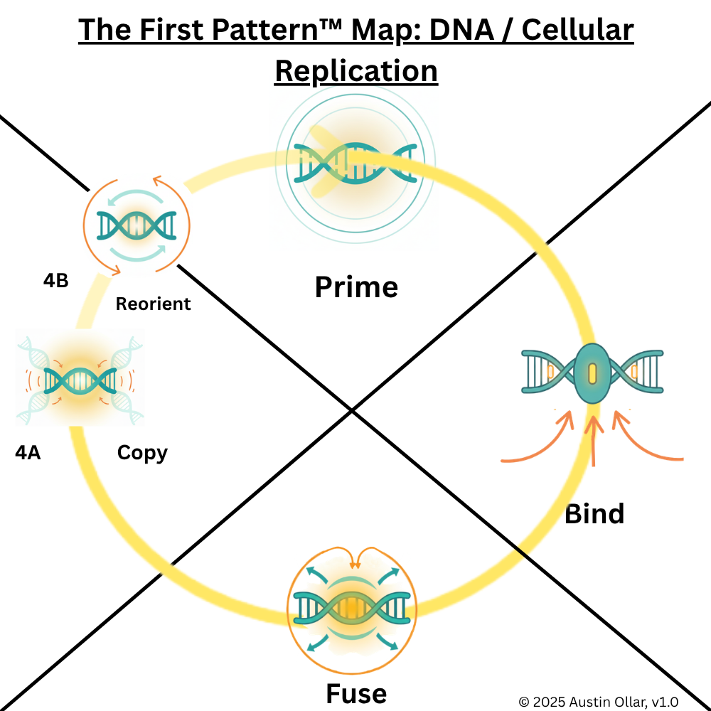 Reorient (4B): Once copying is complete, the strands detach from the replication machinery and reorient into their proper double helix forms. Final proofreading, corrections, and finishing steps take place to ensure structural integrity. This prepares the DNA for the next cycle and feeds back into a fresh Prime state. This is 4B reorientation, where the copied pattern resets into a stable configuration for future use.