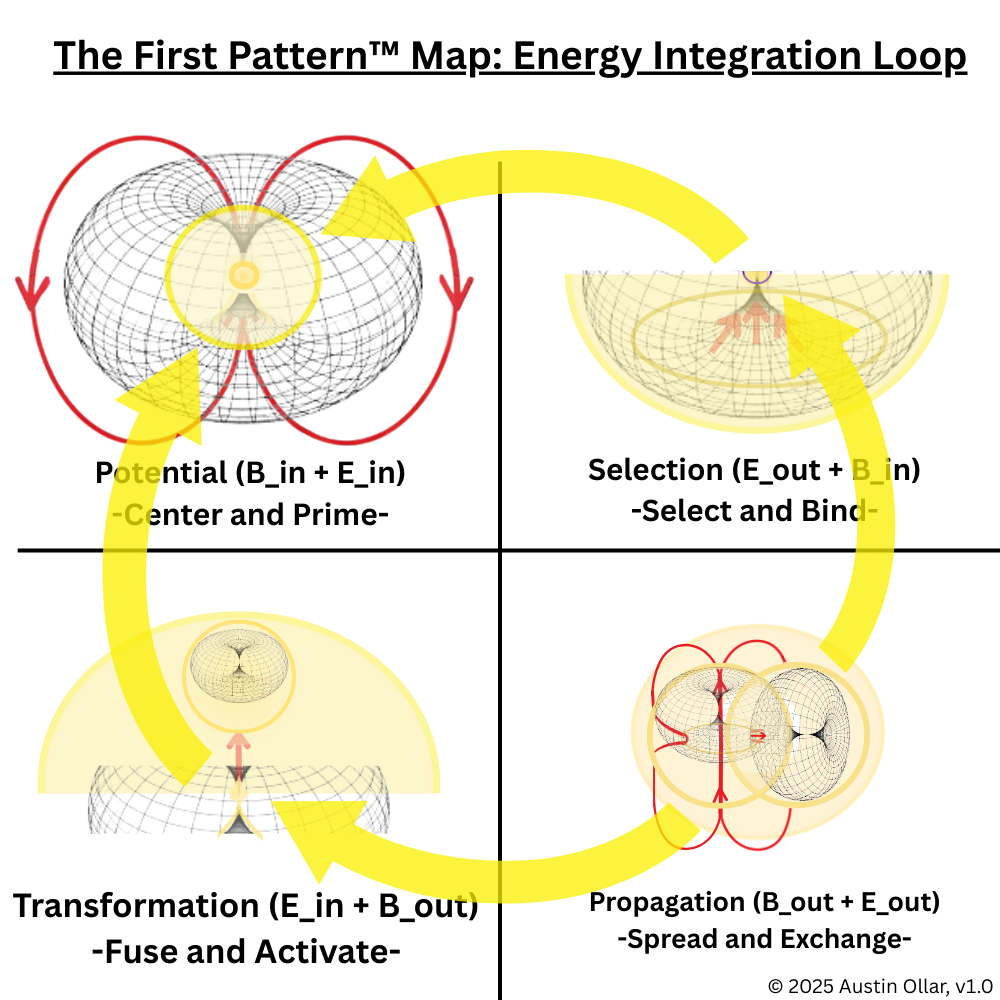 The Energy Integration Loop complements the flow of information by describing how energy stabilizes through splitting and merging. When energy grows unstable, it divides into parts; through interaction, those parts re-combine into a stronger, more coherent whole. Unlike the Information cycle, which is directional, the Energy loop starts at 4A and splits off in two directions simultaneously. While the Information Emergence Cycle goes “downstream” the Energy Integration Loop is its perfect opposite going back “upstream” in a system. This captures the dynamics of resonance, rhythm, and reinforcement — the hidden process by which systems recover balance and gain strength.