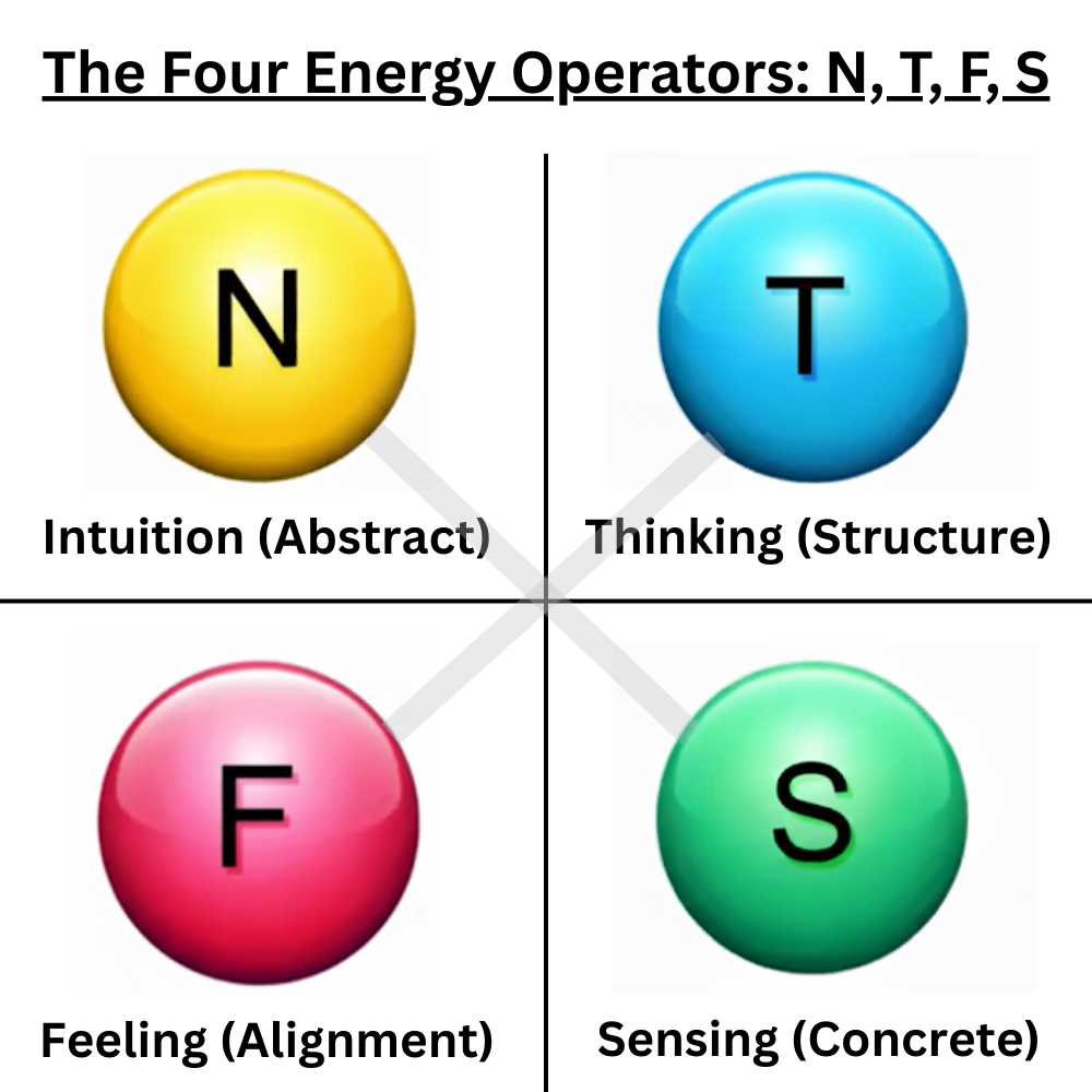 At the foundation of The First Pattern are not only information operators but also four complementary energy operators. These capture the deeper forces that drive how systems stabilize, align, and evolve. They mirror Carl Jung’s psychological functions but are reframed here with more direct, universal terms: