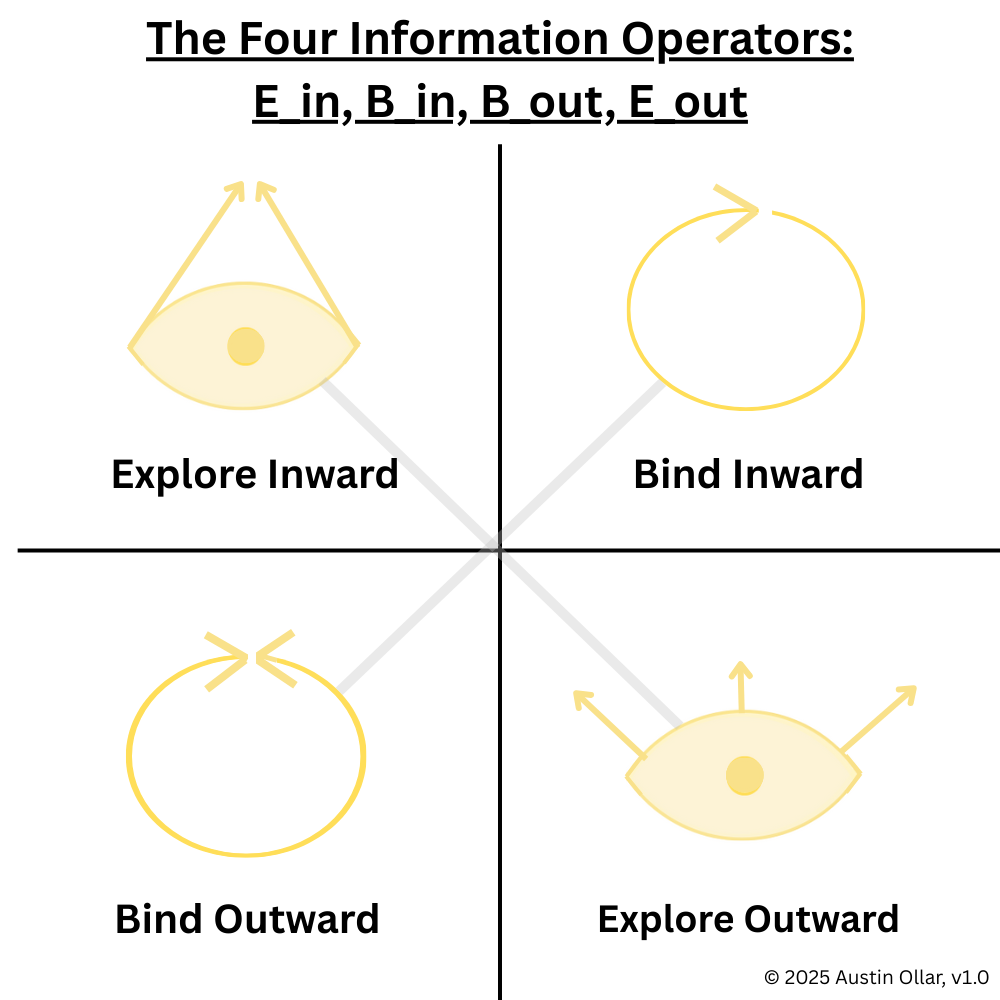 At the core of The First Pattern are four information operators. They define how systems form, stabilize, and propagate: exploring or binding, inward or outward.